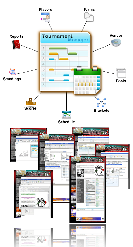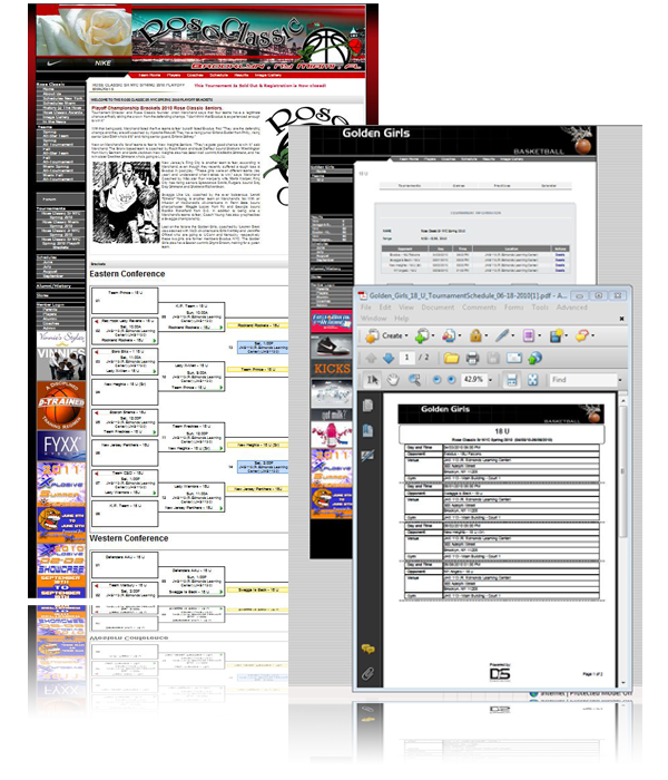 Your Tournament Home Page is auto generated and allows you to easily edit the information or add additional information. Participating Teams / Schedules and Directions / Game Results are all presented on the Tournament Home Page.