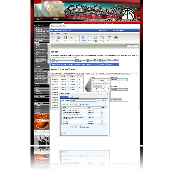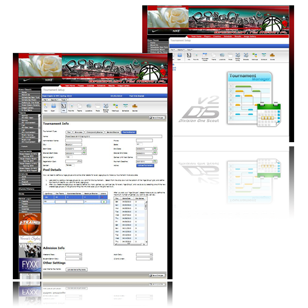 With D1Scout's Tournament Manager you can manage all the processes that it takes to run an efficient smooth tournament from any computer with an internet connection. Communicate with teams and coaches and deliver a professional and precise schedule with no scheduling discrepancies, duplicate games or back to back games. Supply the latest info and updates to teams , players, parents and fans. Deliver a concise scheduling itinerary package with court assignments , opponents names(not just a number you have to weed through numerous documents to find), and venue directions. Leveraging the power of Google Maps and with over 117,000 certified locations in our database your participating teams will not be showing up to an empty parking lot across town wondering where everyone is. The tournament manager not only schedules according to rules you set but even takes travel time from venue to venue into account during the automated scheduling process, and if necessary, supply's venue to venue directions to the team and team members as well.